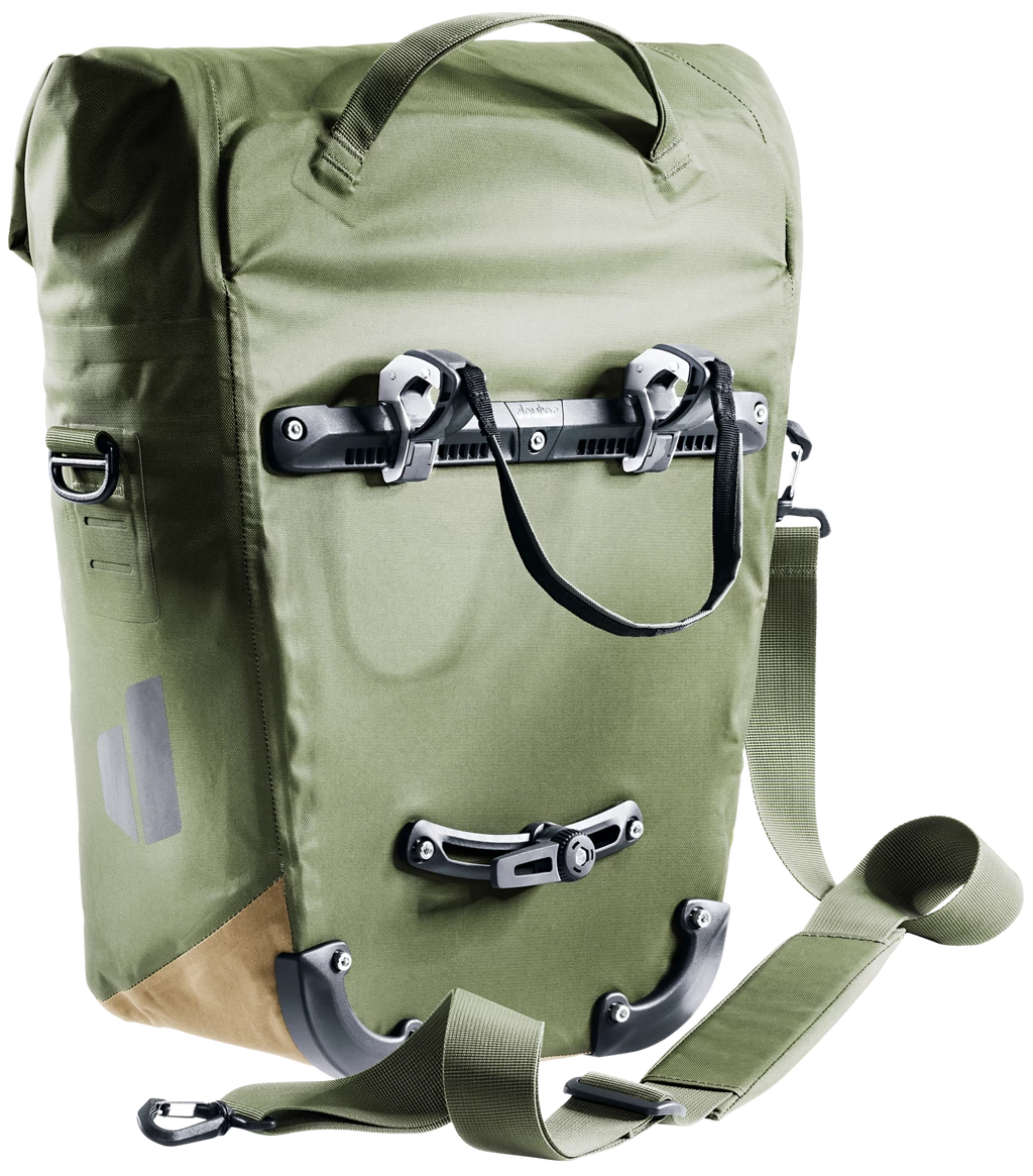 Die multifunktionale Fahrradtasche findet ihren Einsatz als Einkaufs- oder Aufbewahrungstasche am Hinterrad oder, dank einzippbarer Organisationseinheit für Arbeitsunterlagen, als Umhängetasche fürs Büro. Das wasserdichte Material bietet zuverlässigen Schutz vor dem Eindringen der Nässe. Die neue BagFix-Halterung sorgt für maximale Bewegungsfreiheit, da die Last zu 100% auf dem Hinterrad und nicht auf dem Rücken des Bikers liegt und ermöglicht das Abnehmen der Tasche vom Gepäckträger in einem Handgriff. Zudem sorgt die Taschenklappe mit Magnetverschlüssen für zusätzliche 10 Liter Stauraum.