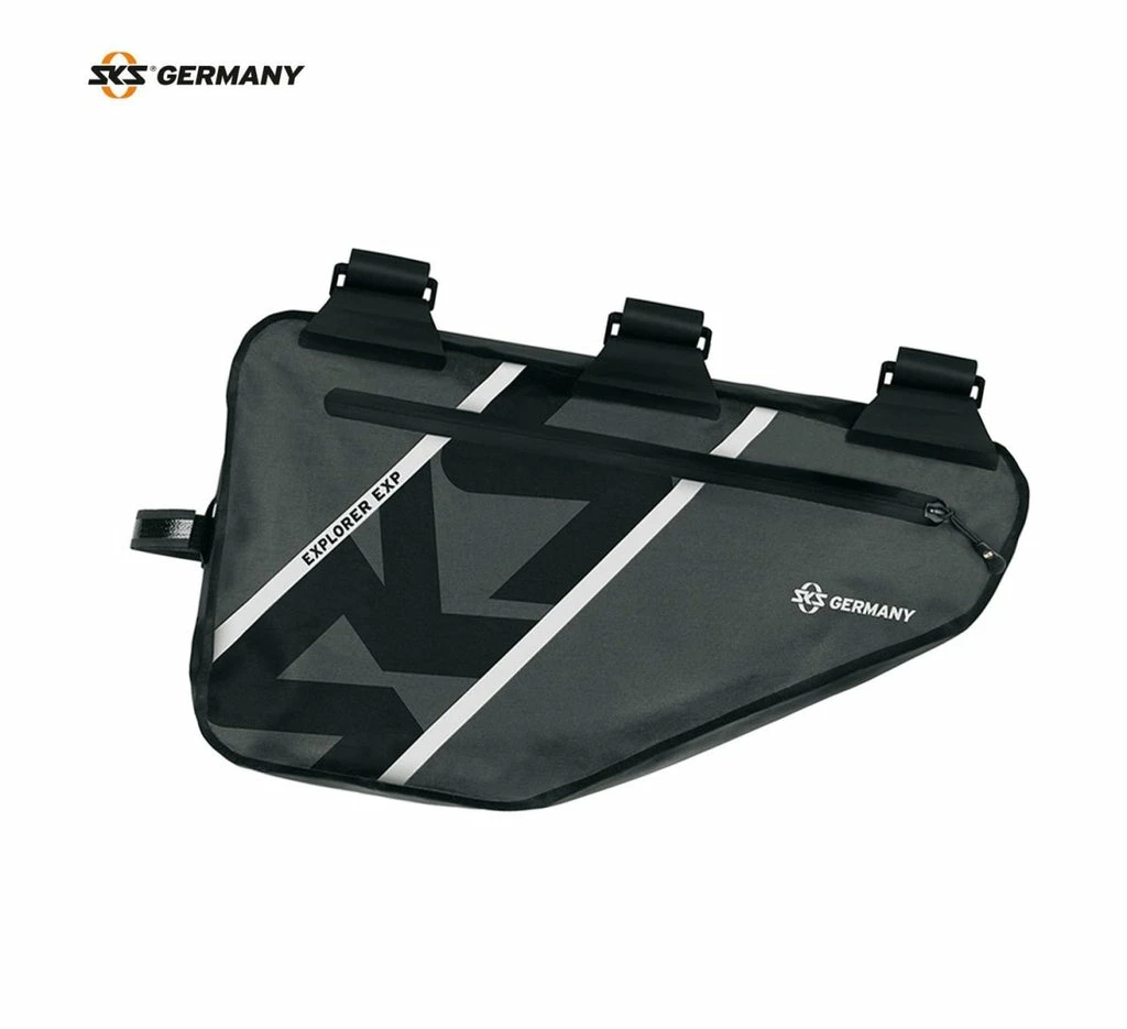 In der Mitte liegt die Kraft. Die EXPLORER EXP. FRAMEBAG bietet einen Stauraum von 4 Litern, ohne dabei das Fahrverhalten zu beeinflussen. Jacke, Flickzeug oder Verpflegung lassen sich dank des wasserdichten Materials mit verschweißten Reißverschlüssen trocken und schmutzgeschützt transportieren. Die Extrafächer für Tool oder Minipumpe, wie die SKS AIRFLEX EXPLORER, sind mit einem Griff erreichbar. Dank der gummierten Laschen mit haftstarkem Klettverschluss ist eine schonende, individuell anpassbare Befestigung am Rahmen möglich.